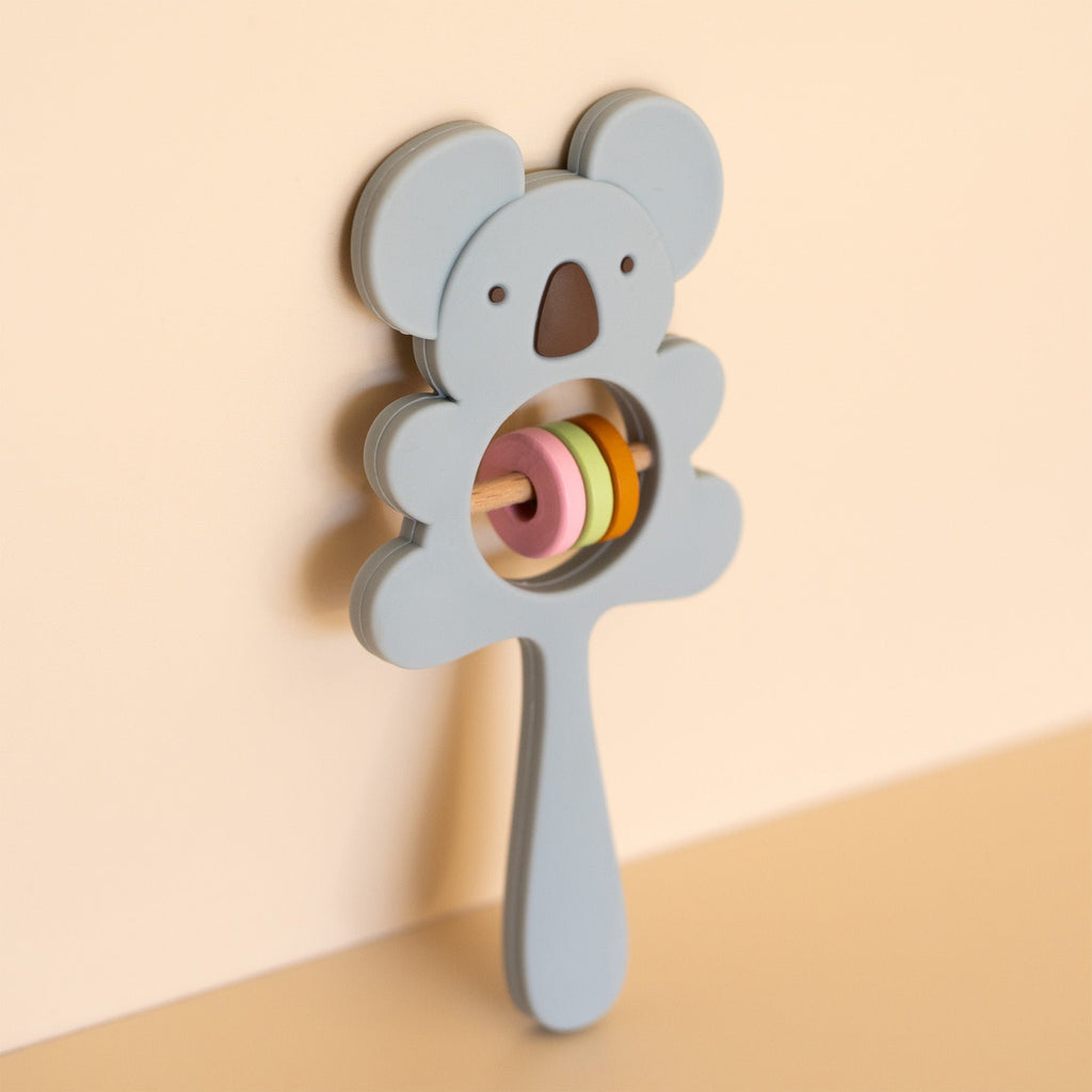 A cute little baby Koala teething rattle! Made from 100% BPA-Free high quality silicon, this is the perfect teether for your baby. Watch as they shake the adorable Koala and listen to the wooden rings rattle together!